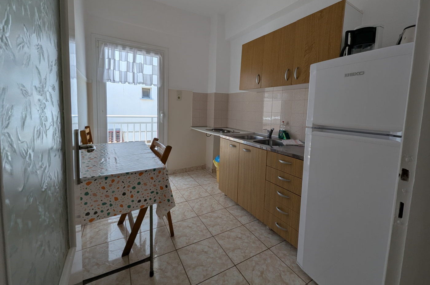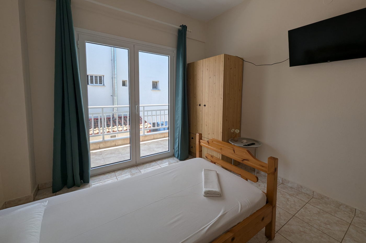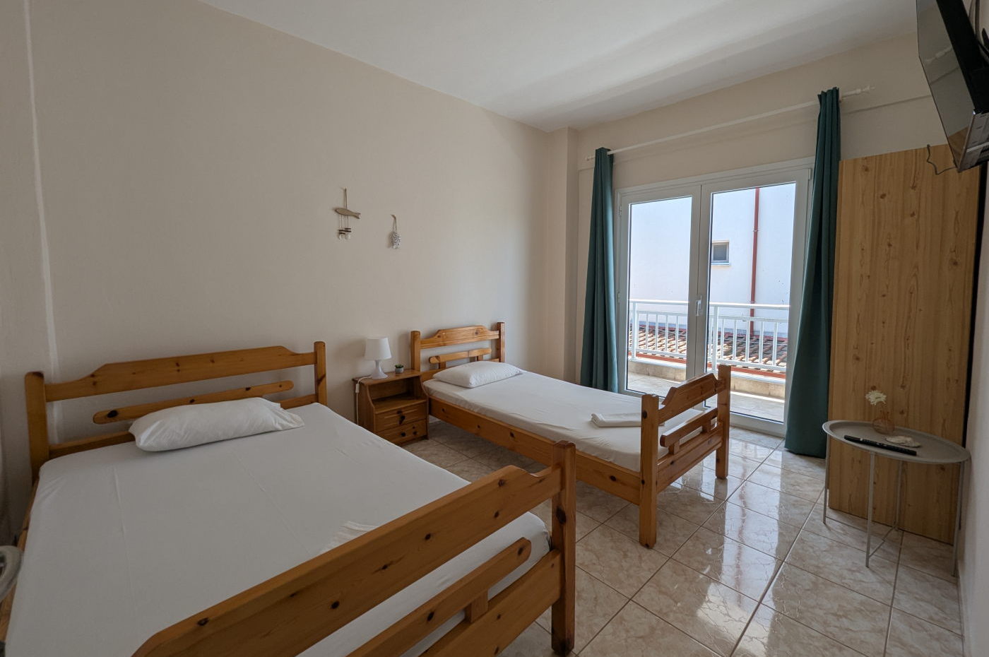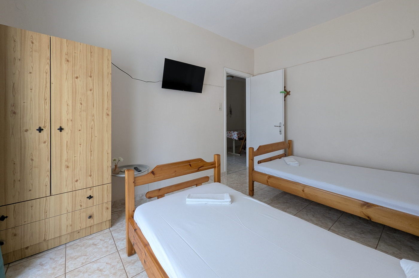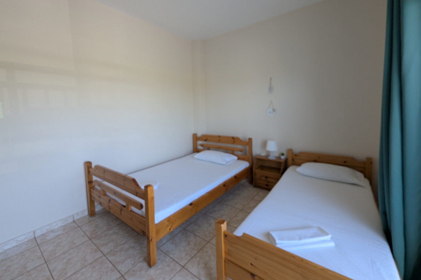 - Δωμάτιο 1 (δωμάτιο με τηλεόραση): 1 μονό κρεβάτι 120 εκ. x 190 εκ. και 1 μονό κρεβάτι 90 εκ. x 190 εκ.
